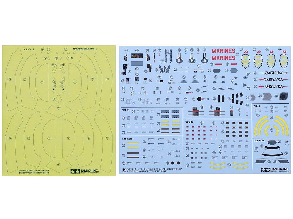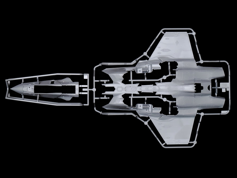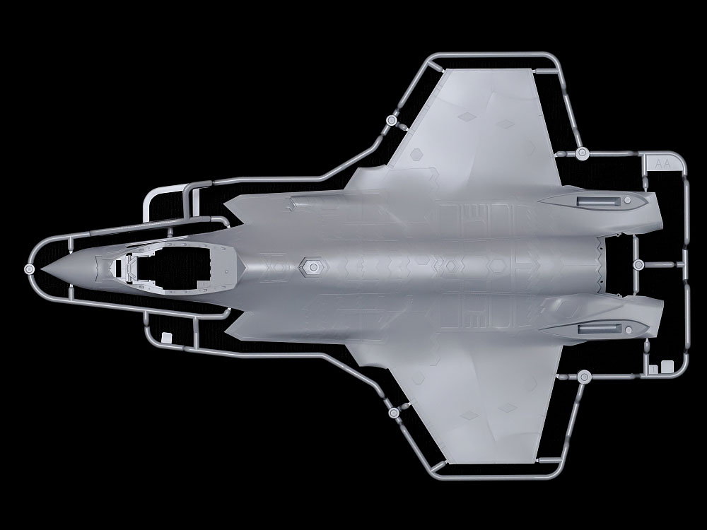 This is a 1/48 scale plastic model assembly kit. Length: 327mm, wingspan: 273mm. ★The low observability design is faithfully depicted. ★Fine recreations of Radar Absorbent Material (RAM) are molded into fuselage surfaces. ★Separate assemblies of folded and extended wingtips can be interchanged after assembly. ★Choose deployed or retracted fuel probe. ★Flaps are depicted down for an accurate parked aircraft. ★The F-35C’s reinforced nose landing gear is recreated in style. ★Arresting hook doors can be depicted open or closed. ★Choose open or closed weapons bay doors. Parts are included for two each of AIM-9X and AIM-120C AMRAAM missiles, plus four GBU-12 and two GBU-31 bombs. ★The optional gun pod is also recreated with accuracy. ★Choose an extended or retracted boarding ladder. ★Wheel chocks are included. ★The kit comes with a seated pilot figure, and 6 marking options plus canopy masking stickers for use in the paint job.